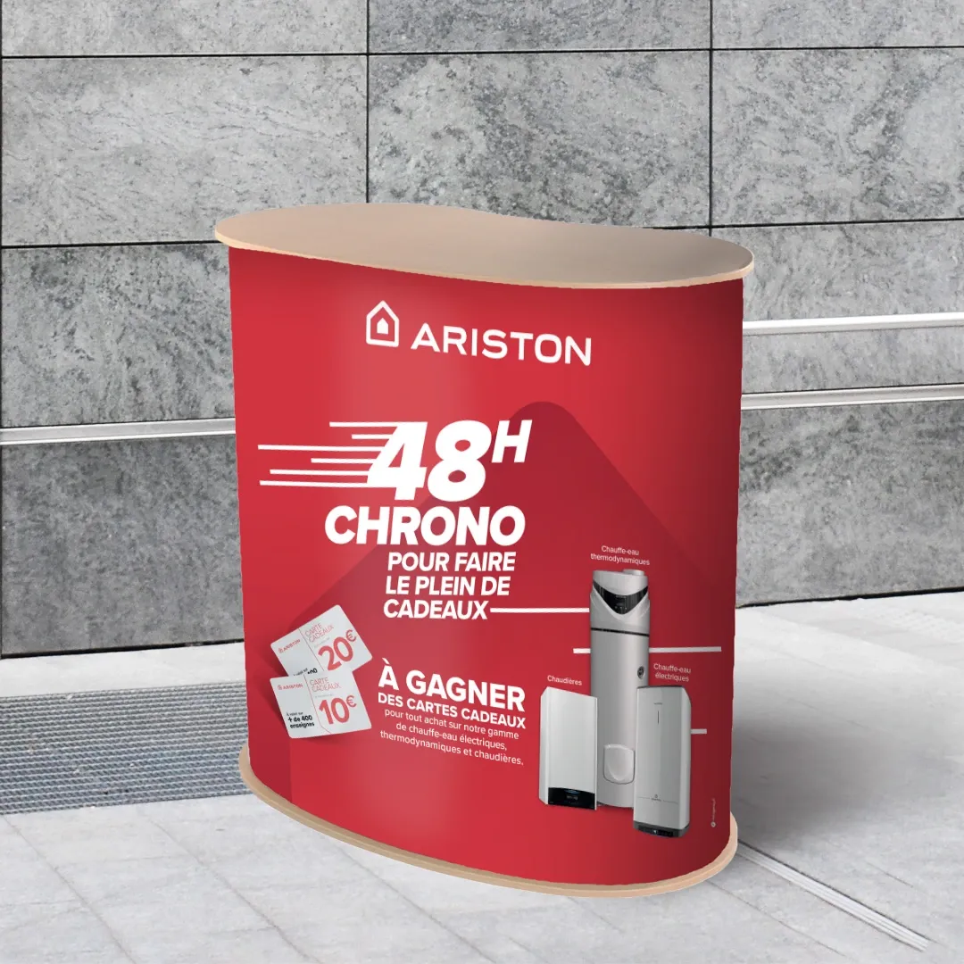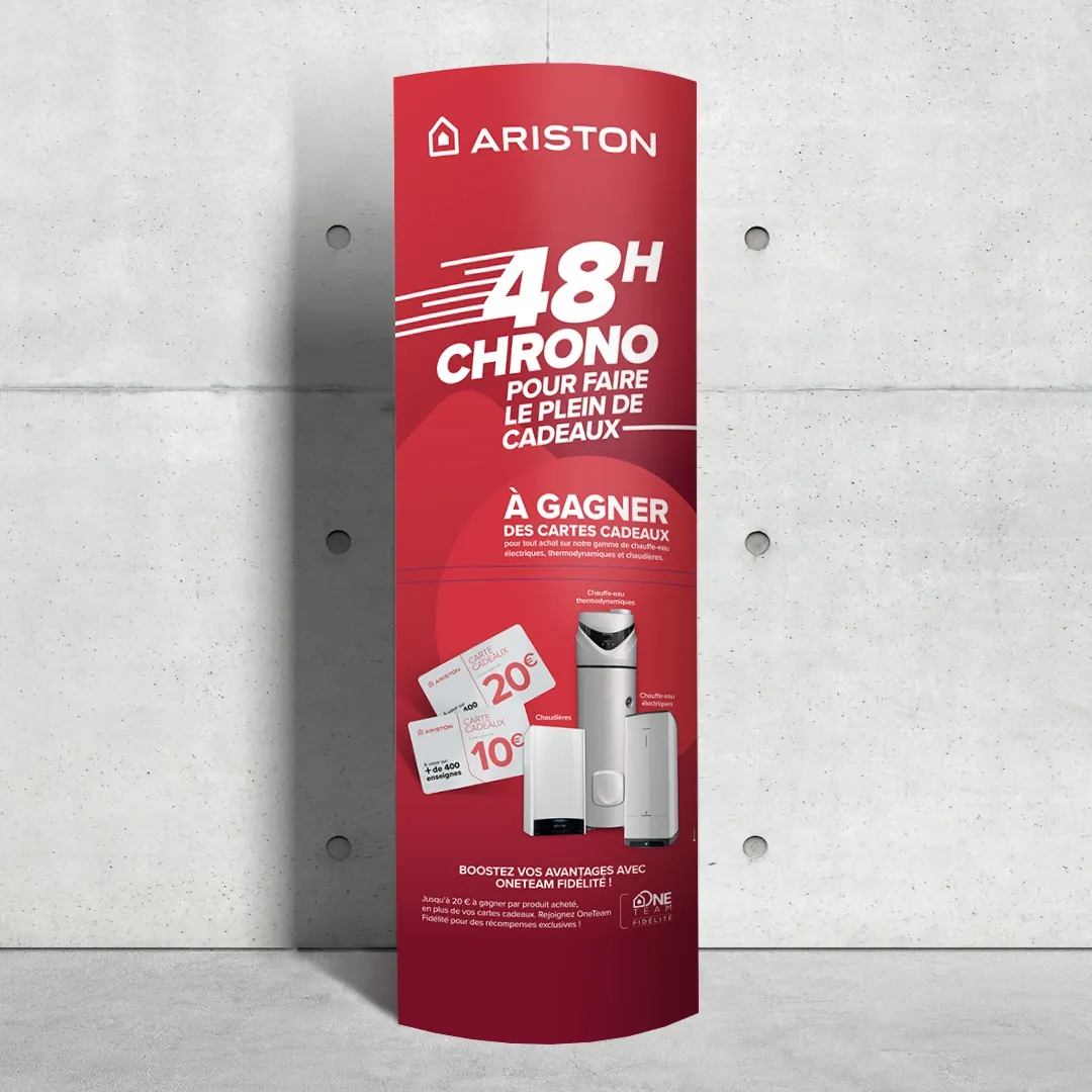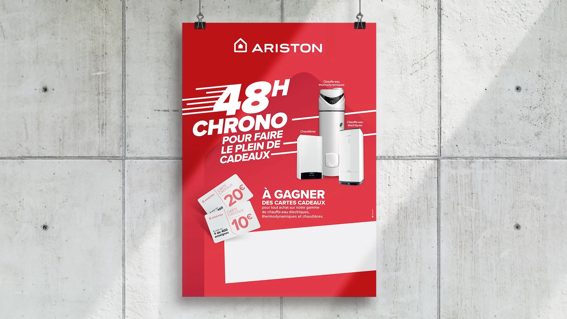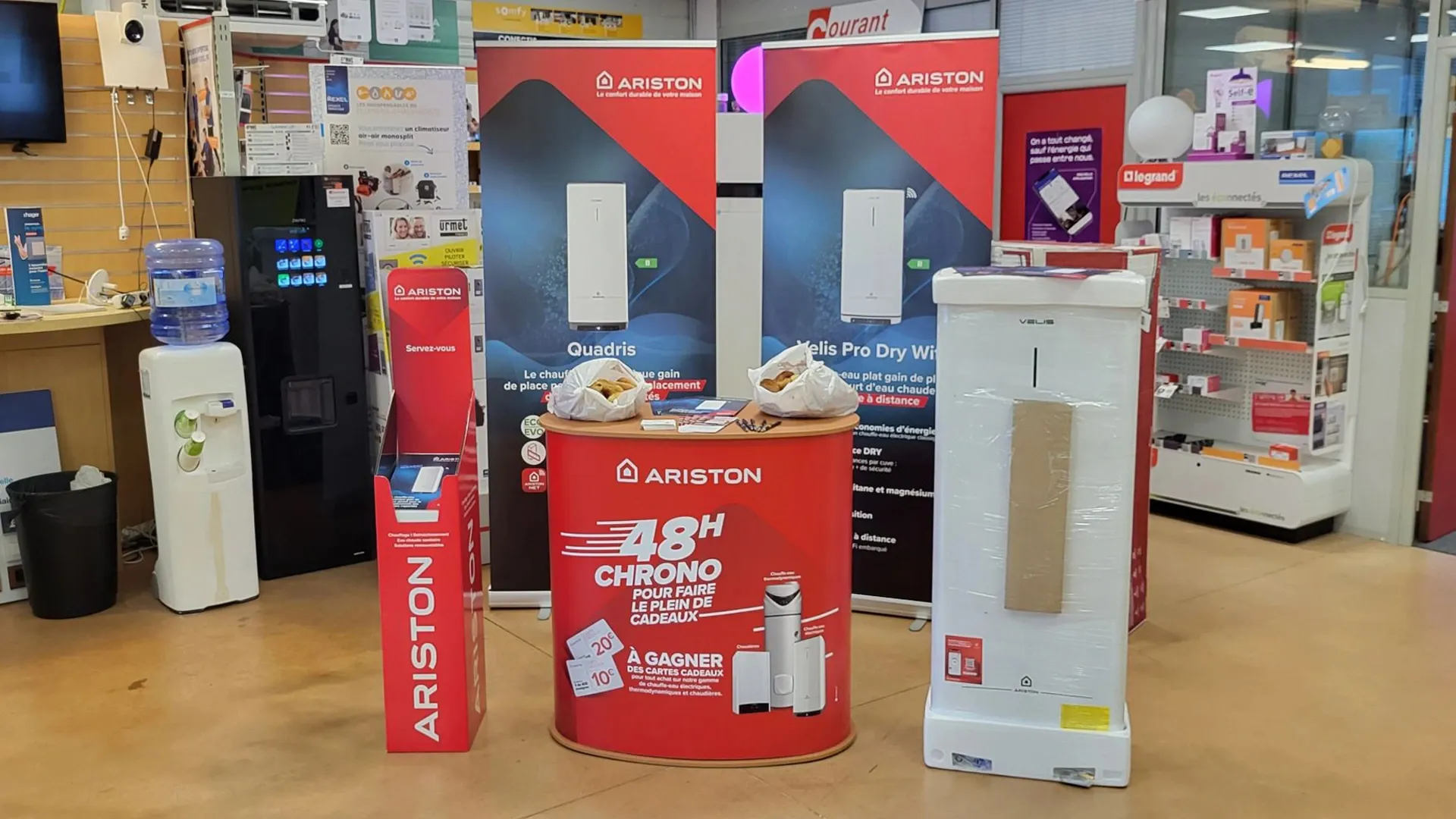Pour animer la distribution et développer les ventes, RED Agency s'est vue confiée la mise en place d'une activation sur 150 points de vente. Une opération Top chrono sur 2 jours d’animations dans chaque point de vente pour faire le plein de cadeaux. Une opération qui repose sur une mécanique promotionnelle : des chèques cadeaux à gagner sur l’achat de chauffe-eau Ariston.