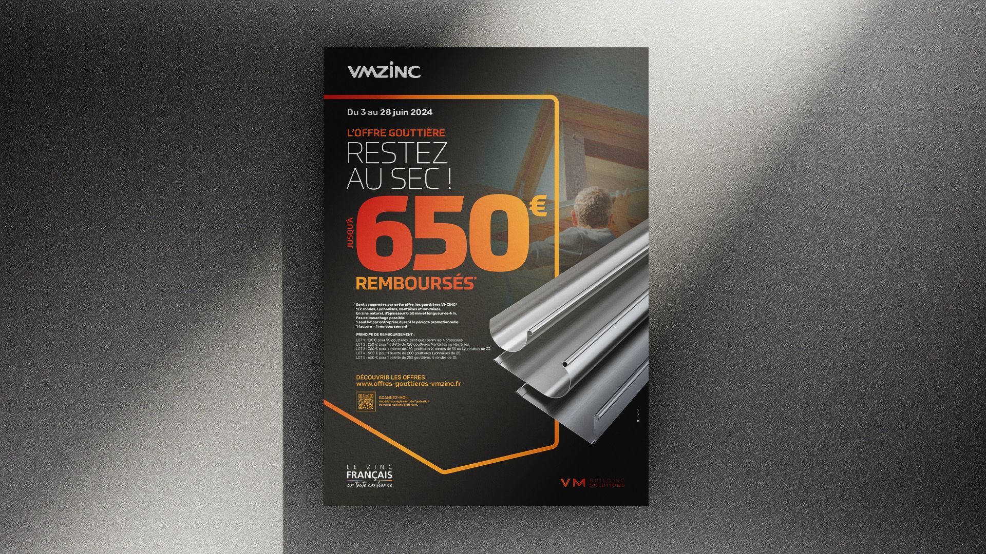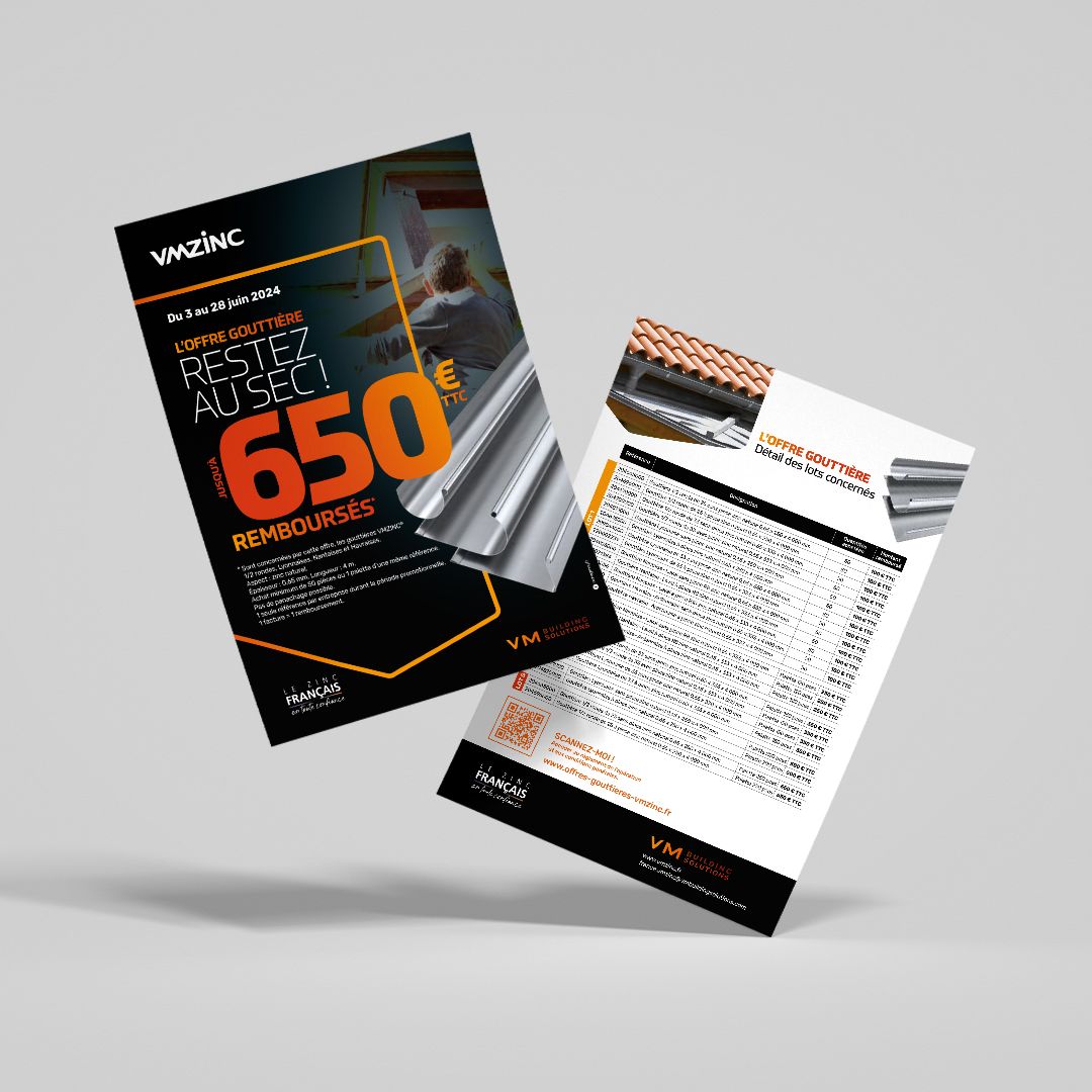 VM BUILDING SOLUTIONS a confié à RED Agency la conception et l’activation d’une opération promotionnelle auprès de son réseau de distributeurs qui s’adresse aux installateurs et plus particulièrement aux entreprises de couverture. L’objectif de l’activation : animer et augmenter les ventes avec une offre de remboursement (ODR) sur les gouttières.