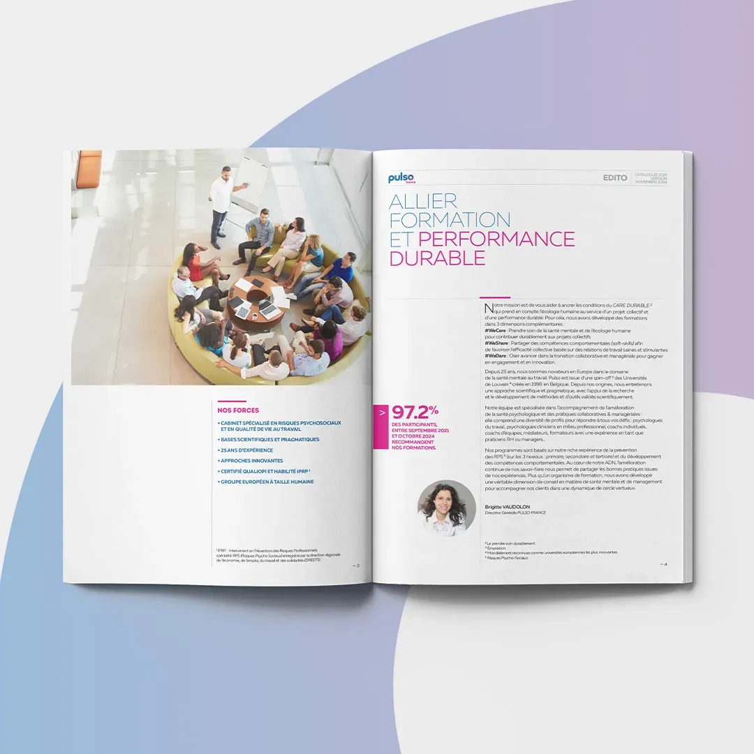 Depuis 25 ans, PULSO est novateur en Europe dans le domaine de la santé mentale au travail. Plus qu’un organisme de formation, PULSO France a développé une véritable dimension de conseil en matière de santé mentale et de management.