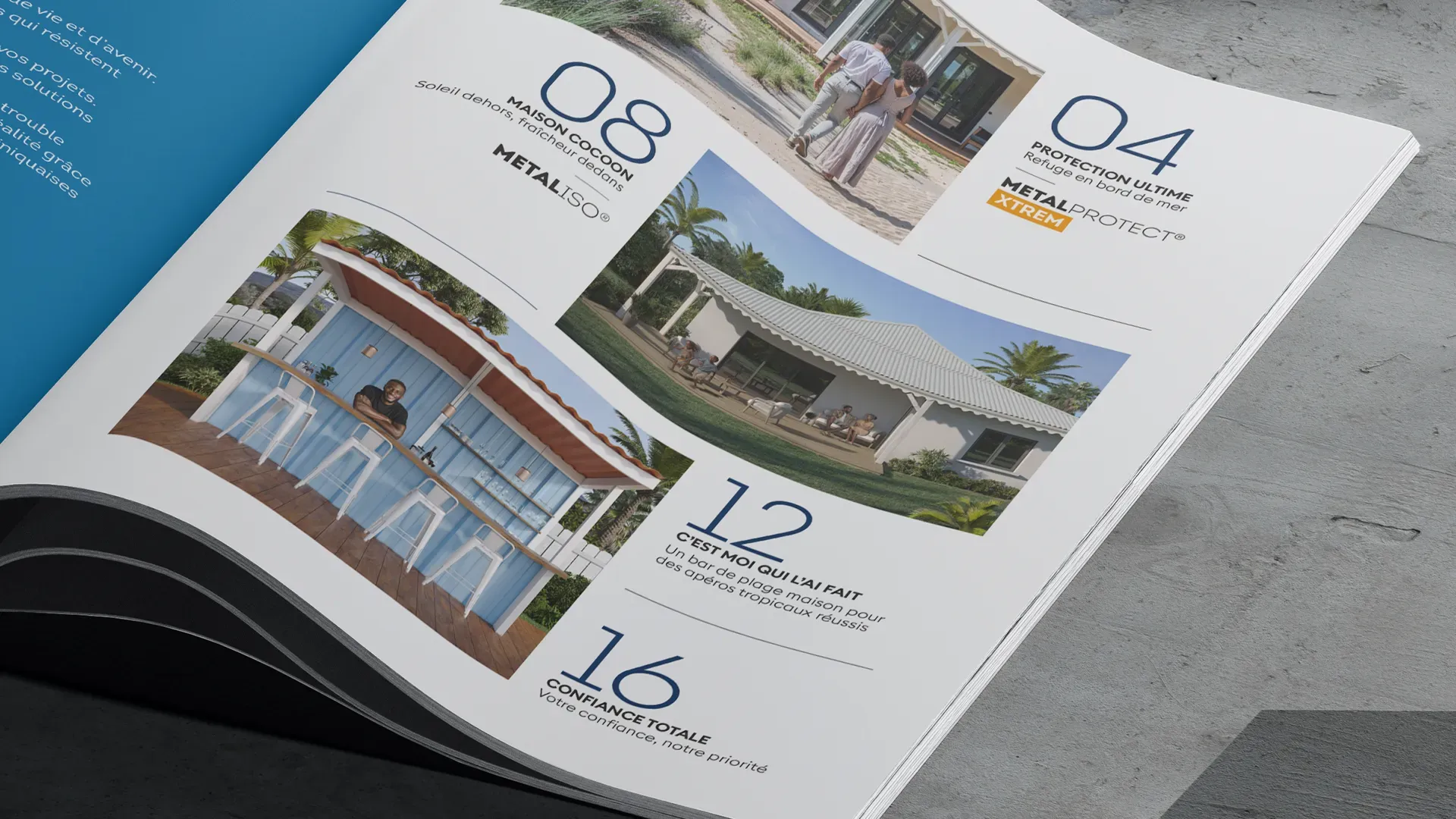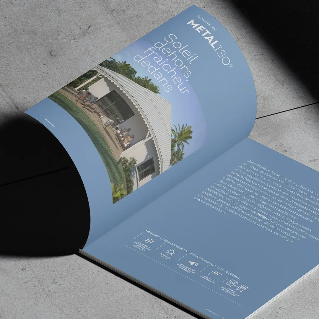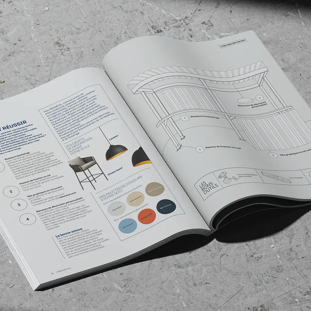 Pour accompagner les architectes et les artisans qui imaginent des solutions avec les tôles Biométal pour leur projet, RED Agency a conçu et réalisé un cahier d'inspiration intitulé KAY (la maison). La première édition fût présentée sur le stand.