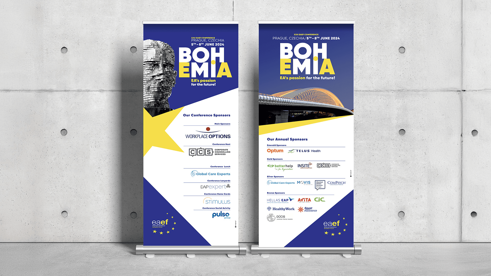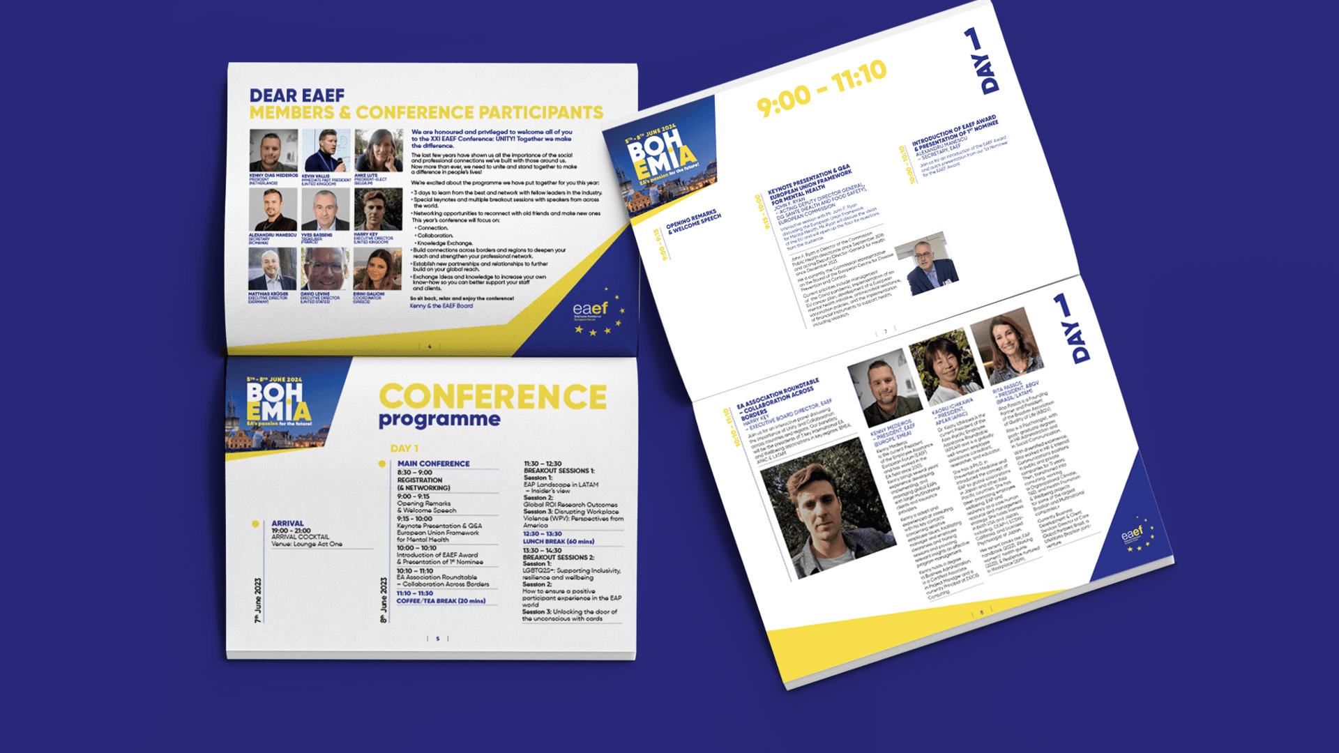 L'EAEF (Employee Assistance European Forum) est une association européenne regroupant des professionnels des programmes d'aide aux employés, de la santé et du bien-être au travail C'est une organisation à but non lucratif dont l'objet est de participer à l'amélioration des solutions de bien-être au travail en Europe depuis 2002. Étant un Forum, l'EAEF accueille les membres individuels et organisationnels intéressés par les partages d'expertises et de bonnes pratiques. RED AGENCY s'est vue confier l’identité visuelle de la XXIIe conférence de l'EAEF à Prague et la création des outils de communication : le programme, le roll-up et le tote bag de la conférence.