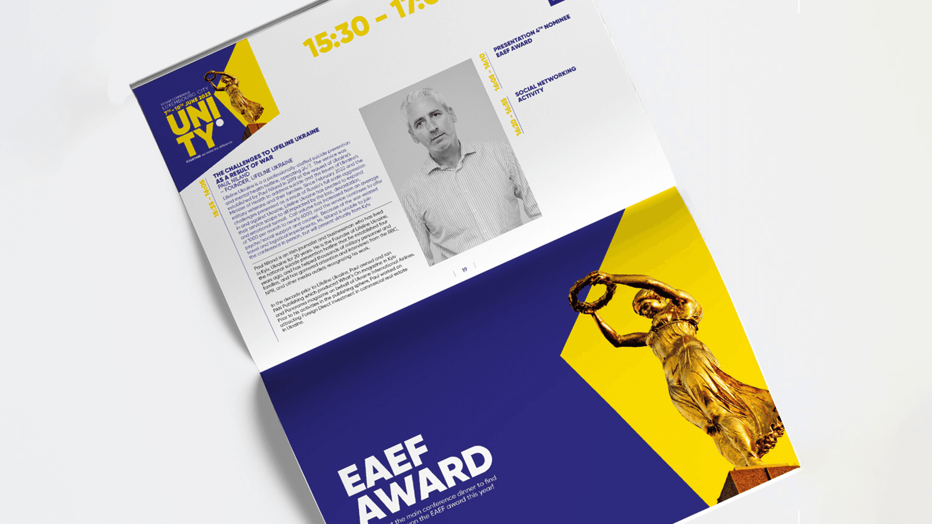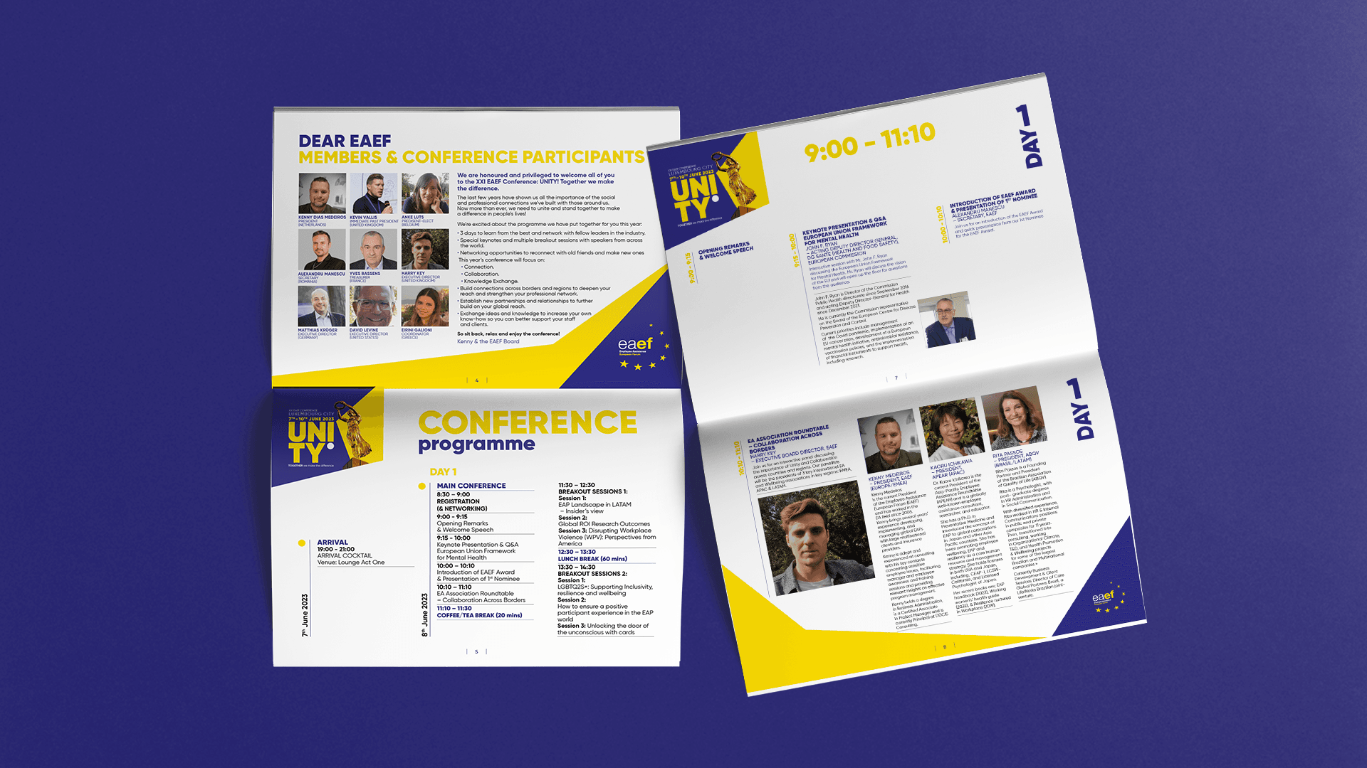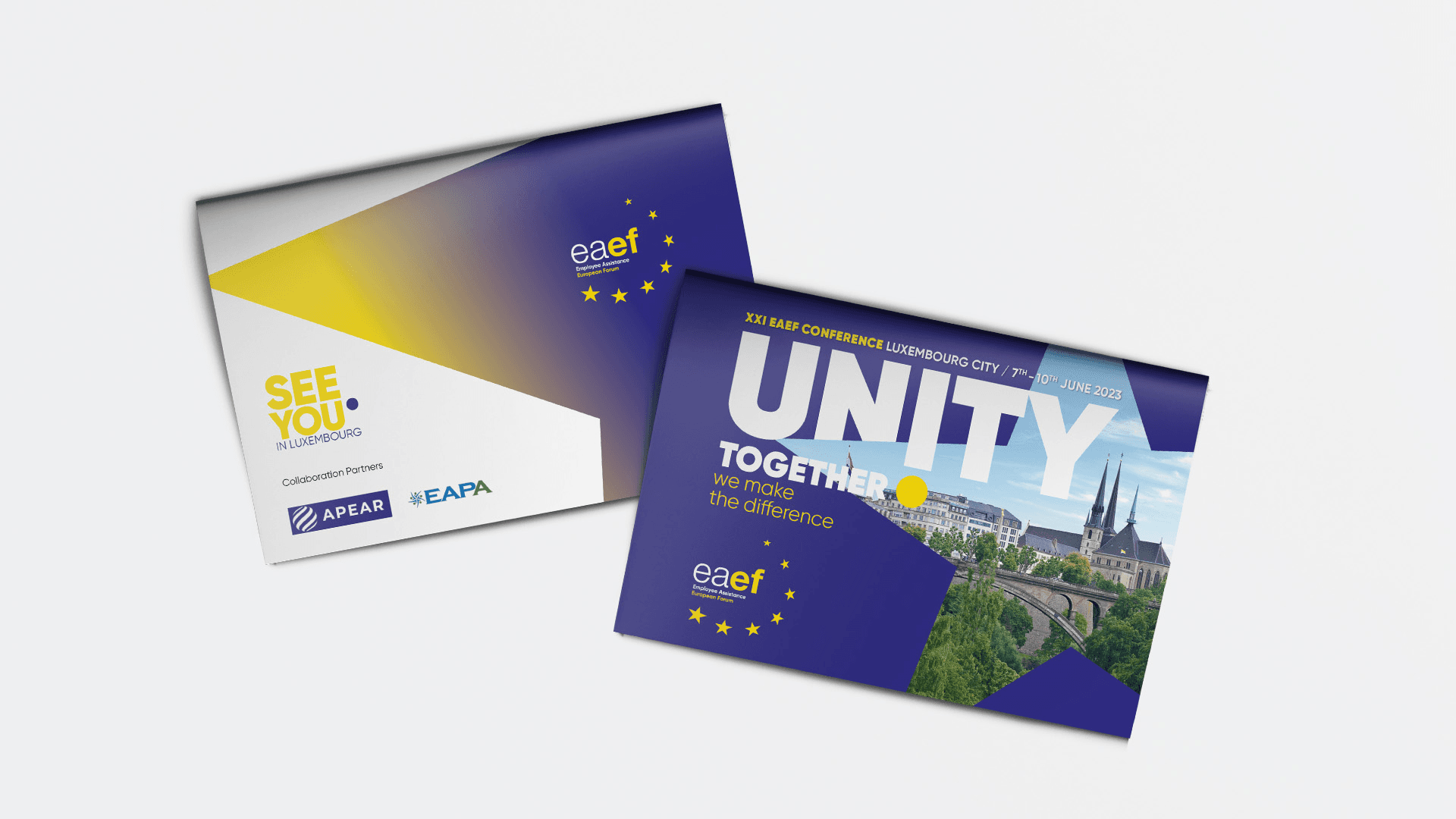 L'EAEF (Employee Assistance European Forum) est une association européenne regroupant des professionnels des programmes d'aide aux employés, de la santé et du bien-être au travail C'est une organisation à but non lucratif dont l'objet est de participer à l'amélioration des solutions de bien-être au travail en Europe depuis 2002. Étant un Forum, l'EAEF accueille les membres individuels et organisationnels intéressés par les partages d'expertises et de bonnes pratiques. RED Agency s'est vue confier l’identité visuelle de la XXIe conférence de l'EAEF au Luxembourg et la création des outils de communication : le programme, le roll-up et le tote bag de la conférence.