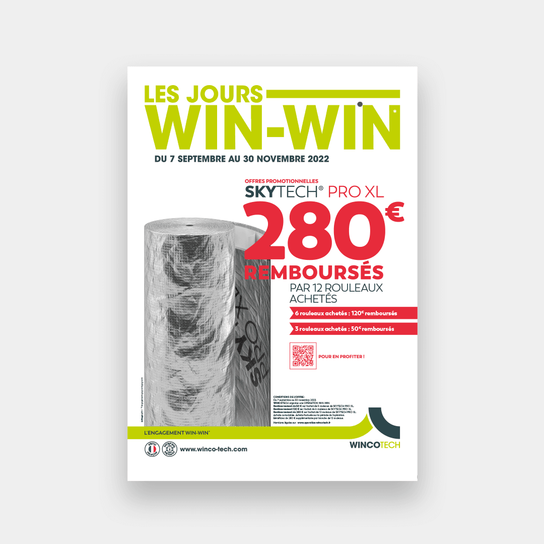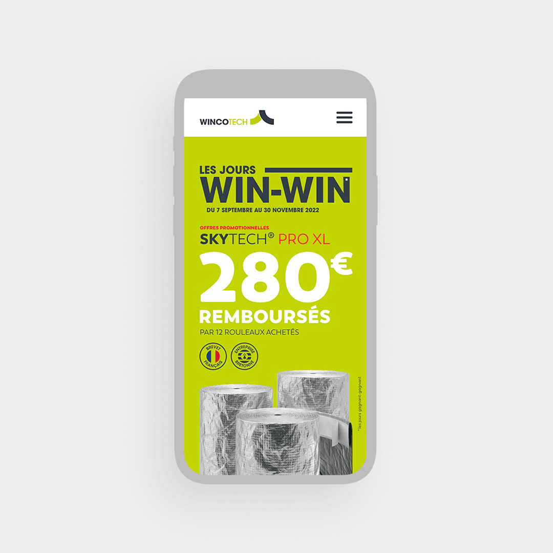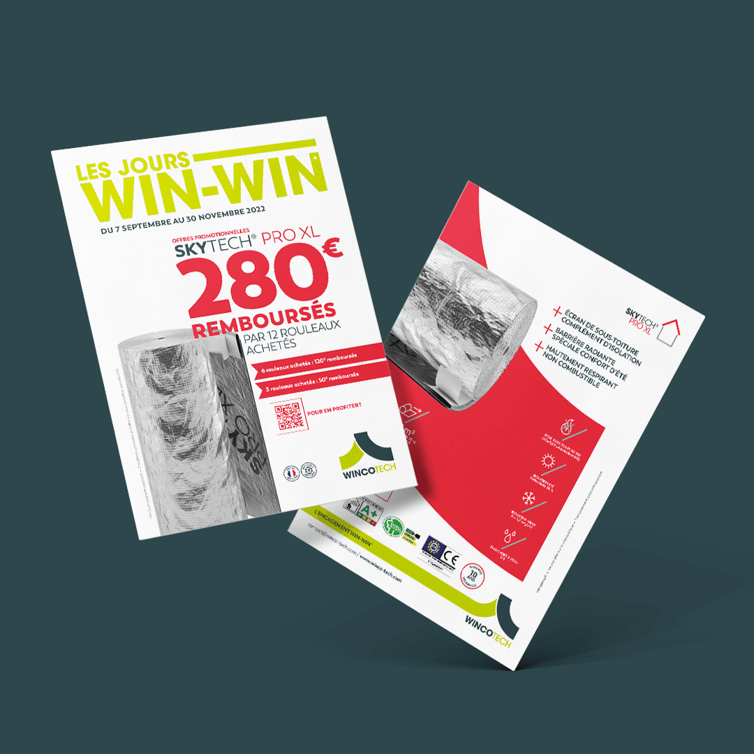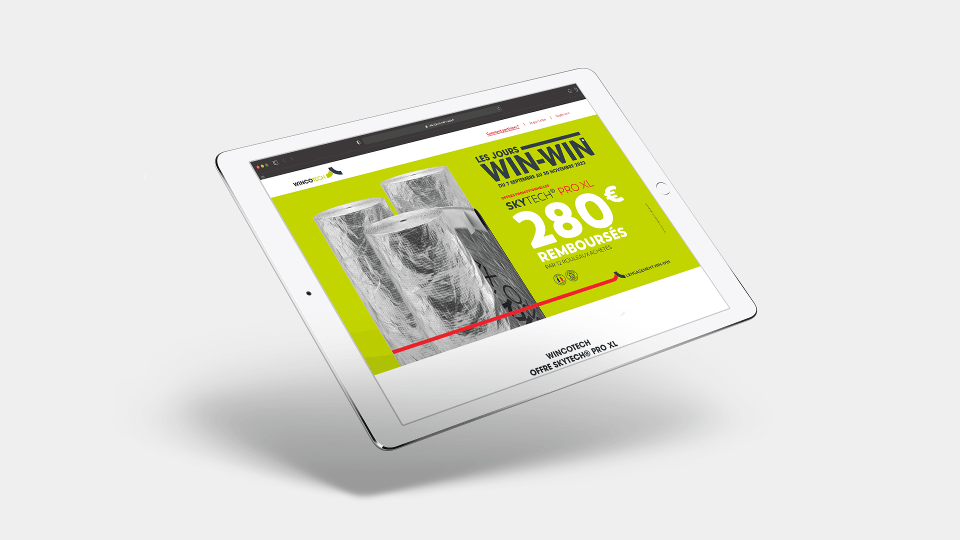 Pour accompagner son développement commercial en France, WINCOTECH et son agence, RED Agency ont mis en place une opération promotionnelle autour du produit « star », le SKYTECH PRO XL, le seul écran sous-toiture HPV isolant et non combustible. Une offre promotionnelle qui s’appuie sur une ODR (Offre de remboursement) importante qui diminue le prix d’achat unitaire. Au programme : une landing page dédiée à l’opération, un kit de communication magasin (PLV, Flyer) et des bannières web.