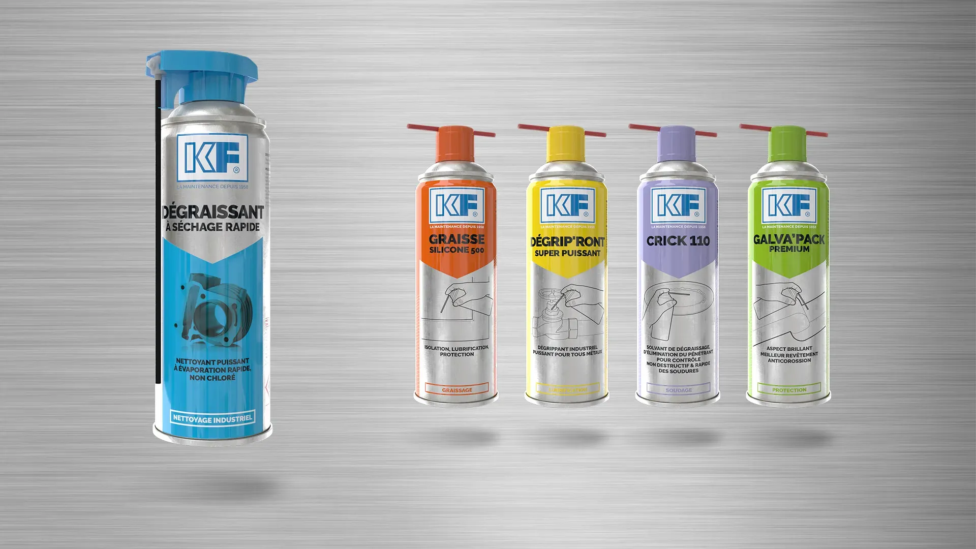 Depuis 50 ans, KF est le leader français dans la fabrication et la distribution de produits chimiques destinés aux secteurs de l’industrie, du bâtiment, de la bureautique, de l’informatique et de l’électronique. Les produits KF répondent à tous les besoins en proposant 450 références, réparties en 9 gammes : la protection, la lubrification, le graissage, le soudage, l’assemblage et la fixation, le nettoyage industriel, la droguerie, le nettoyage de précision, les peintures. Les objectifs : fidélité, confiance, l’utilisateur doit pouvoir se reposer sur la marque KF. Affirmer une posture de leader auprès de la distribution. Augmenter la valeur de la catégorie. Affirmer l’ADN de pionnier de KF qui est toujours à la pointe, aime les défis, qu’ils soient produits, services, commerciaux, environnementaux. Le parti-pris : VALORISER LA TÂCHE À EFFECTUER PAR LE PROFESSIONNEL. Avec KF, vous pouvez vous appuyer sur des produits efficaces qui répondent parfaitement à vos besoins et contraintes.