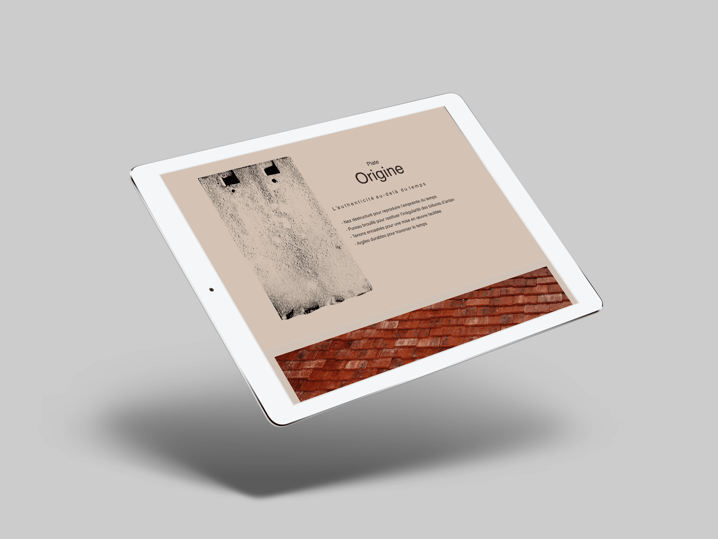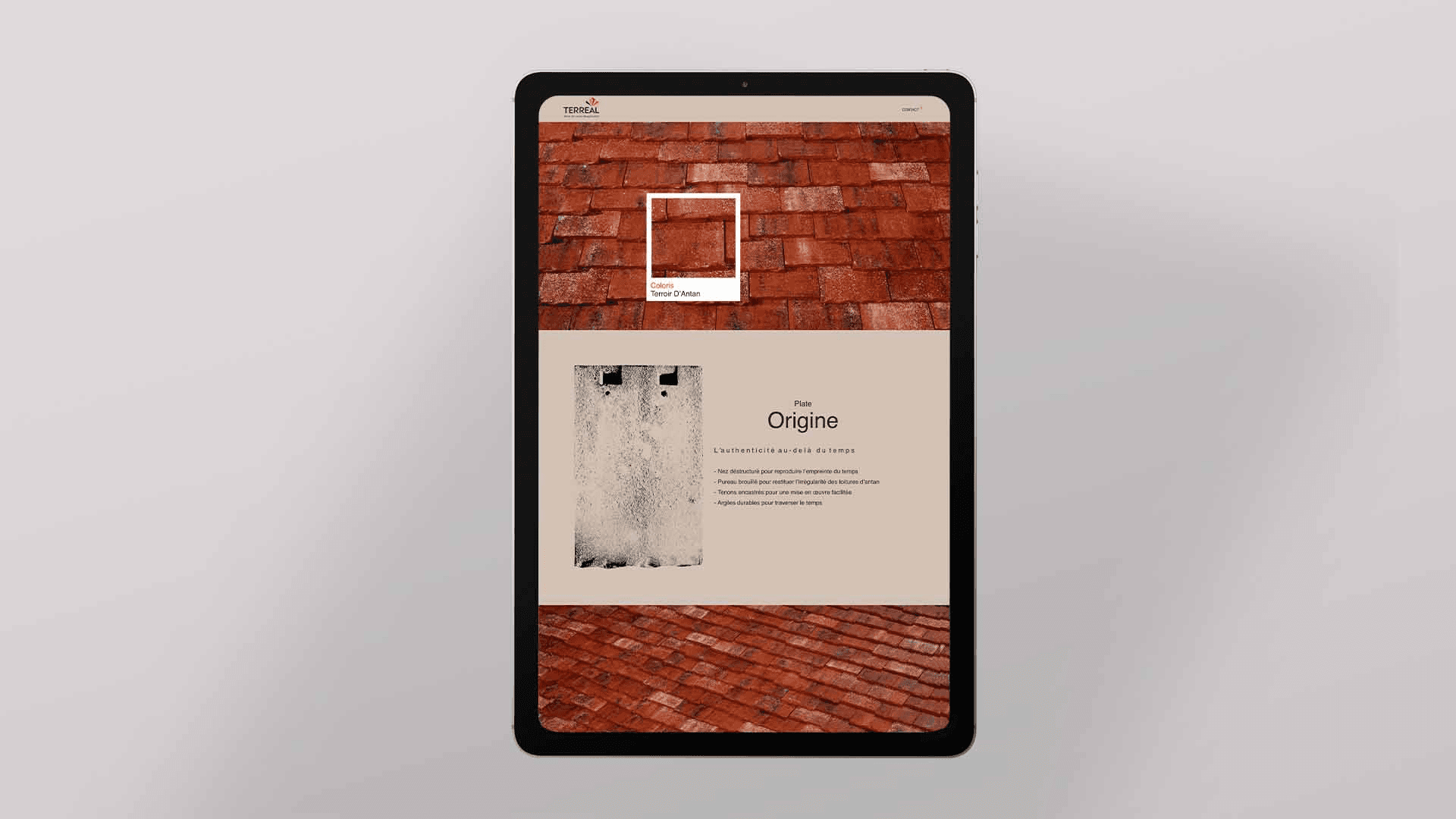TERREAL est un groupe industriel innovant et responsable, qui trouve son origine dans les matériaux de construction en terre cuite. Dans le cadre du lancement de la tuile Plate Origine, le groupe souhaite présenter de manière interactive son nouveau produit. L’objectif : faire un focus sur les + produits de la Plate Origine comme la couleur, la texture ou encore le nez déstructuré.