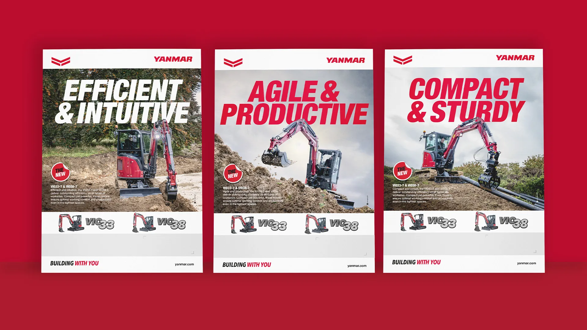 YANMAR a confié à RED AGgency la création du visuel de 2 nouvelles versions de mini-pelles sur chenilles ViO33 et ViO38. L’objectif : mettre en avant les principales améliorations et le nouveau design. Le parti pris créatif de l’agence a été de montrer que ces solutions de chantier sont performantes, compactes, polyvalentes et permettent de travailler de manière efficace et productive dans des espaces restreints.